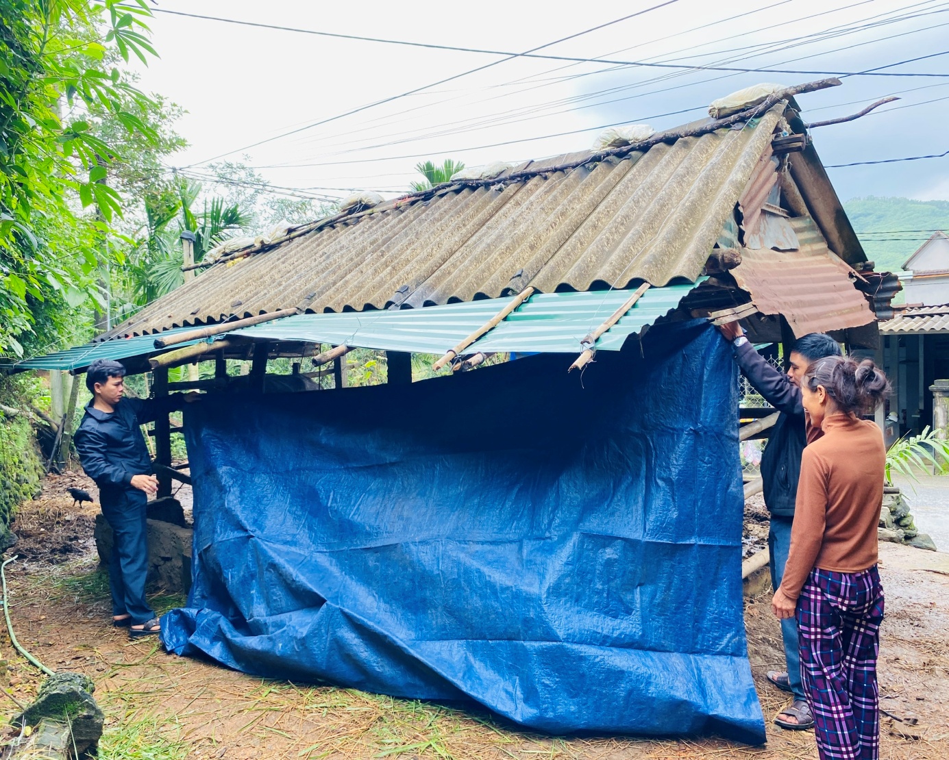 Cán bộ kỹ thuật của Trung tâm Cung ứng dịch vụ công xã Sơn Mai hướng dẫn người dân thôn Mai Lãnh Hạ cách che chắn chuồng trại