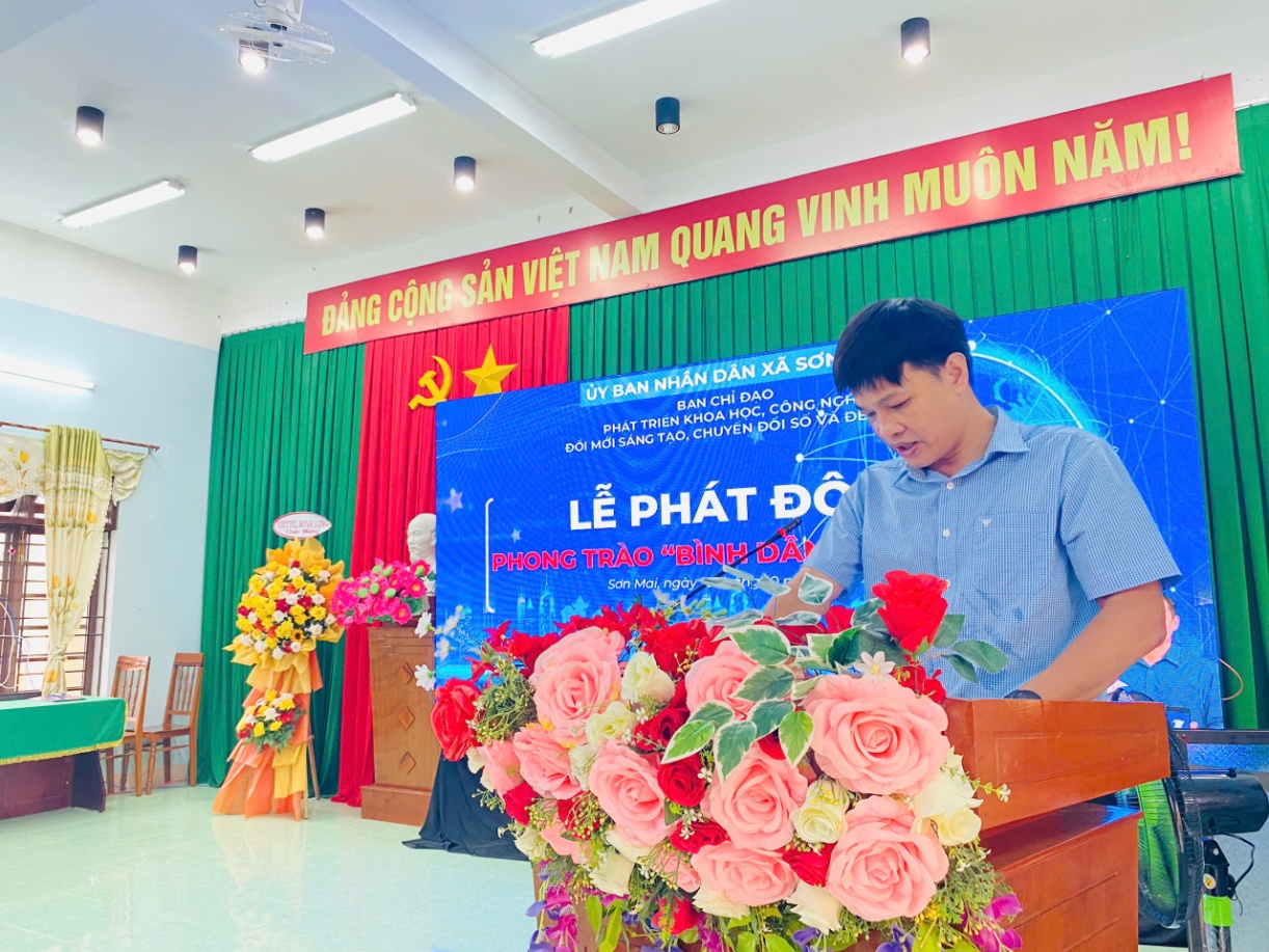 Sáng ngày 16/10, UBND xã Sơn Mai tổ chức Lễ phát động phong trào “Bình dân học vụ số”. Đây là hoạt động nhằm tạo sự chuyển biến mạnh mẽ trong nhận thức, hành động của cả hệ thống chính trị và toàn xã hội về vai trò, ý nghĩa của chuyển đổi số, góp phần lan tỏa tinh thần tự học, tự nâng cao tri thức, kỹ năng số, chuyển quá trình học tập, rèn luyện, nâng cao và ứng dụng tri thức số trở thành nhu cầu tự thân của mỗi người dân. Dự Lễ phát động, có Phó Giám đốc Sở Khoa học và Công nghệ Phan Thanh Hiếu; Giám đốc Trung tâm Chuyển đổi số và đổi mới sáng tại tỉnh Trần Duy Linh; Phó Bí thư, Chủ tịch UBND xã Nguyễn Anh Tuấn; Phó Chủ tịch HĐND xã Lê Thanh Hải; Phó Chủ tịch UBND xã Đinh Thanh Minh.